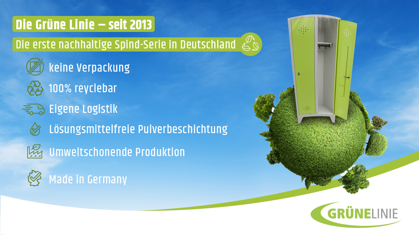Neun Jahre ist es mittlerweile her, dass wir mit der Grünen Linie das Thema Nachhaltigkeit und Spinde miteinander vereint haben - als erste und einzige auf dem Markt. Nach wie vor liegt uns das Thema Nachhaltigkeit besonders am Herzen. Intern versuchen wir so weit es geht auf Papier zu verzichten und auch der Kontakt nach außen findet immer weniger auf dem konventionellen Postweg statt. Vielmehr achten wir auch bei unserer täglichen Arbeit auf ein ressourcenschonenden Ablauf, ohne hierbei Prozesse zu verkomplizieren. Auch unsere Kunden schätzen seit vielen Jahren unser stetig wachsendes Portfolio an nachhaltig produzierten und gelieferten Schränken. Denn bei der grünen Linie endet die Nachhaltigkeit nicht mit dem fertig produzierten Schrank, der nicht wie gewohnt lackiert wird, sondern lösungsmittelfrei Pulverbeschichtet ist. Der Grüne Gedanke zieht sich durch, bis zur Anlieferung beim Kunden. Der Transport der Schränke erfolgt in speziell gepolsterten Möbeltransportern, dies macht eine Verpackung überflüssig - so konnten in den vergangenen neun Jahren unzählige Kilogramm an Stretchfolie eingespart werden. Zudem werden alle Schränke der grünen Linie in Deutschland produziert, lange Transportwege entfallen damit. Ein Gesamtkonzept mit dem wir seit mittlerweile neun Jahren unseren Beitrag zum Schutz unserer Umwelt leisten. Denn Nachhaltigkeit geht uns alle etwas an.