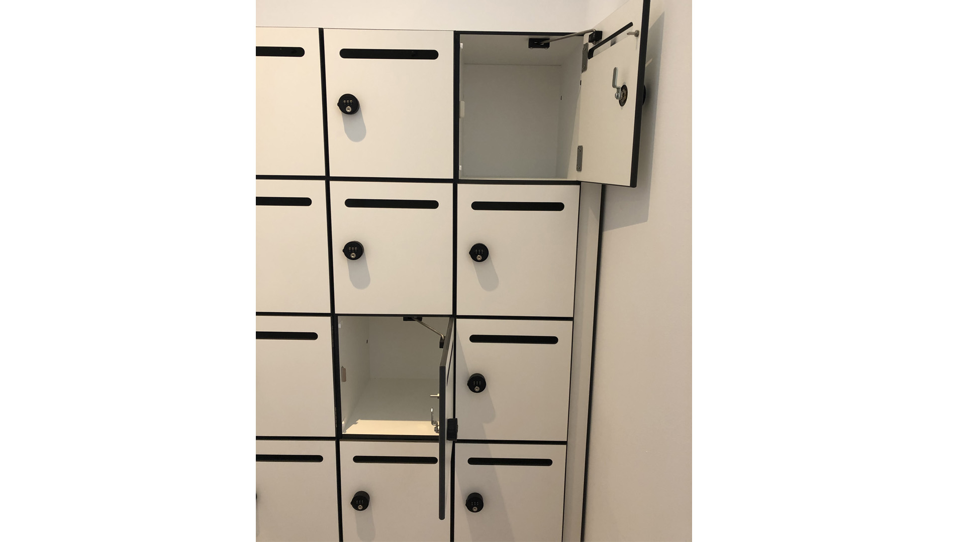 Die Schließfachschränke sind schlicht gehalten in weiß und verleihen den Raum eine ordentliche und neutrale Optik.