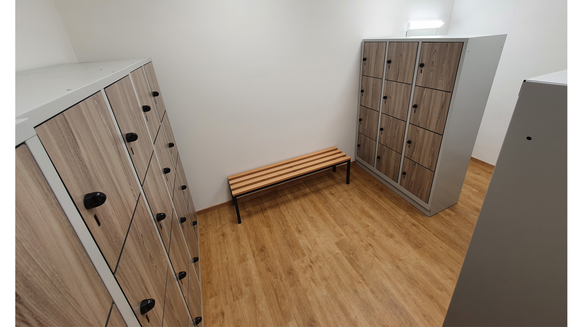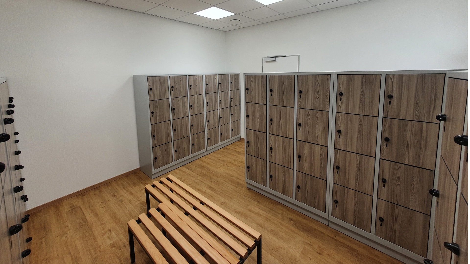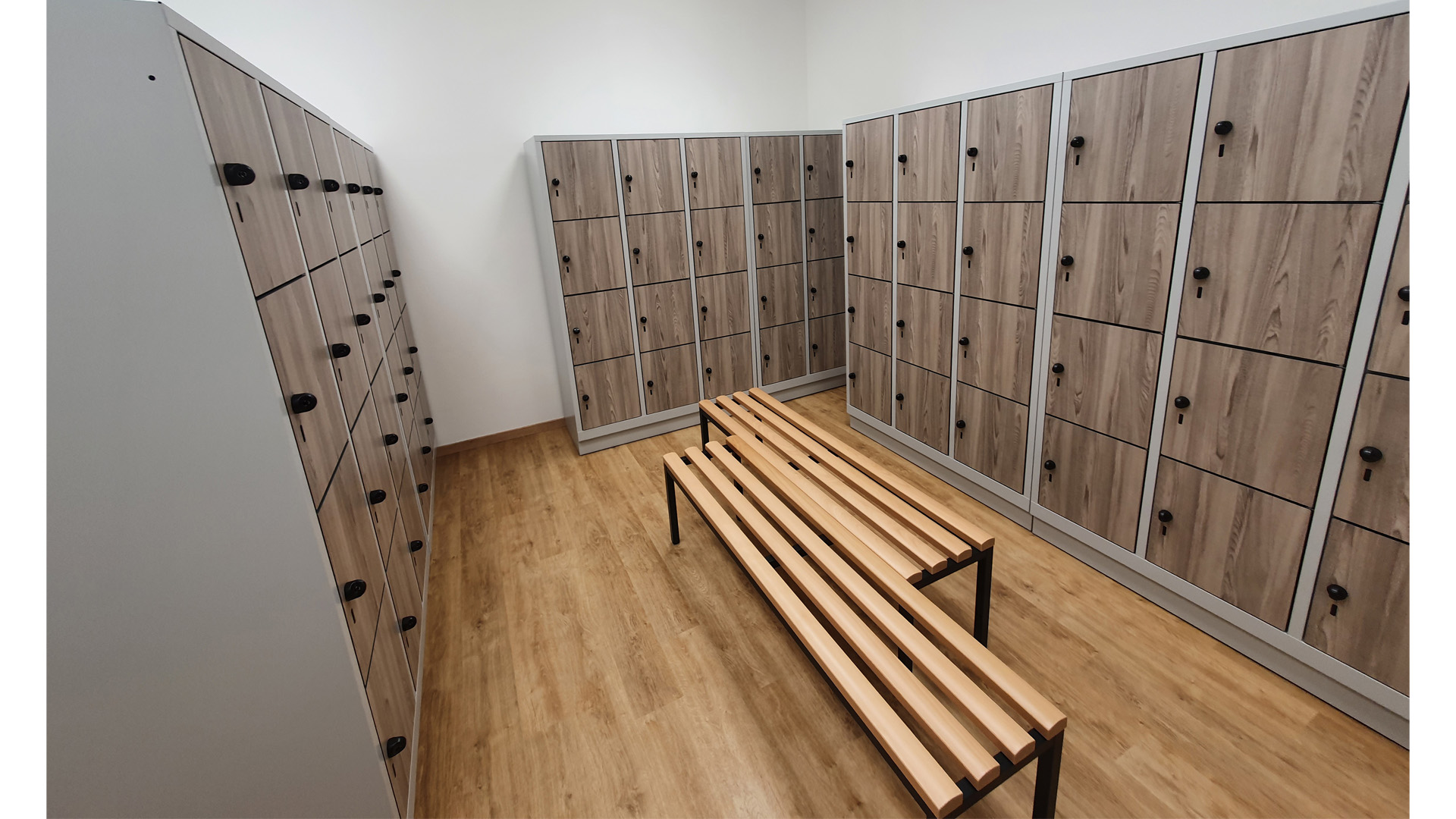 Durch die HPL Fronten in Holzoptik wirkt die Umkleide sehr freundlich und angenehm.