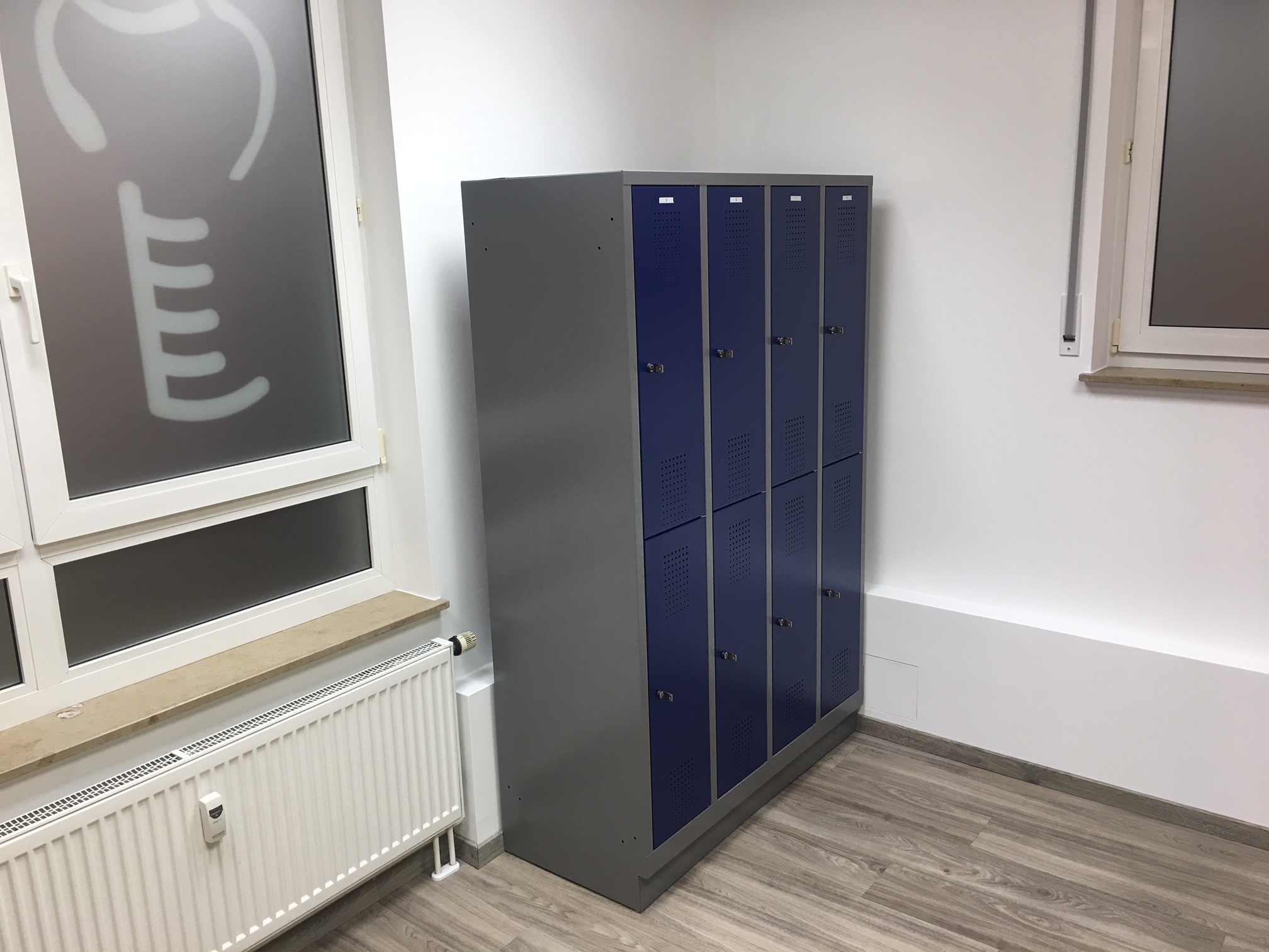 Spind auf Sockel mit vier Abteilen und acht Fächern. Ausführung je Fach: 1 Kleiderstange mit 3 Kunststoff-Kleiderhaken.Maße: 1800mm hoch, 1190mm breit, 500mm tief.