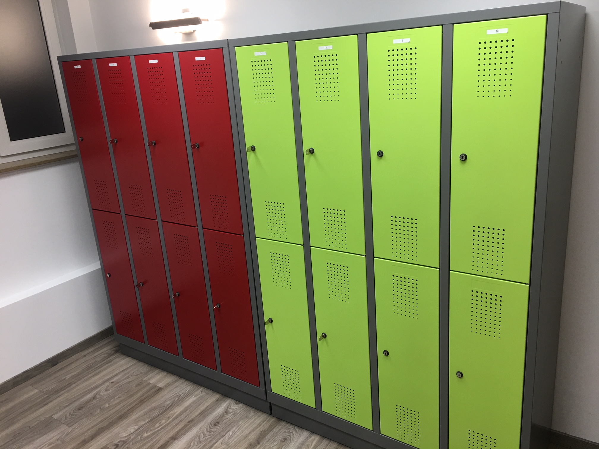 Unser Kunde wollte bisschen Farbe in die triste Umkleide bringen und entschied sich für Spinde der Serie Evolo bei Spindmax. Der Korpus bei allen Schränken wurde in Vulkangrau RDS 0005000 gehalten. Die Türen eines Schrankes sind in Lapisblau, des anderen Schrankes in Feuerrot RAL 3000 und des anderen Schrankes in Viridingrün RDS 1108060.