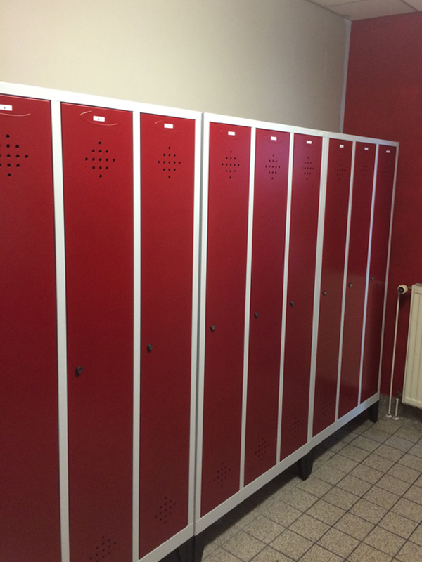 Mit unseren Schränken der Serie Grüne Linie in RAL 7035 Lichtgrau und RAL 3000 Feuerrot wurde die vorhandene Fläche perfekt genutzt.