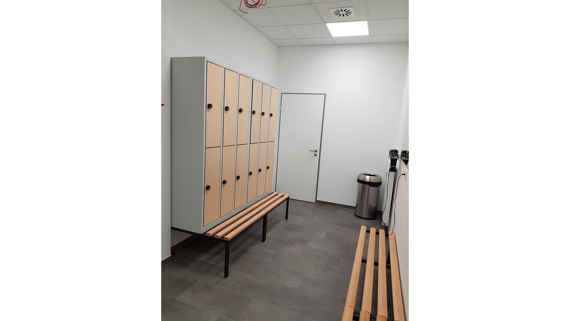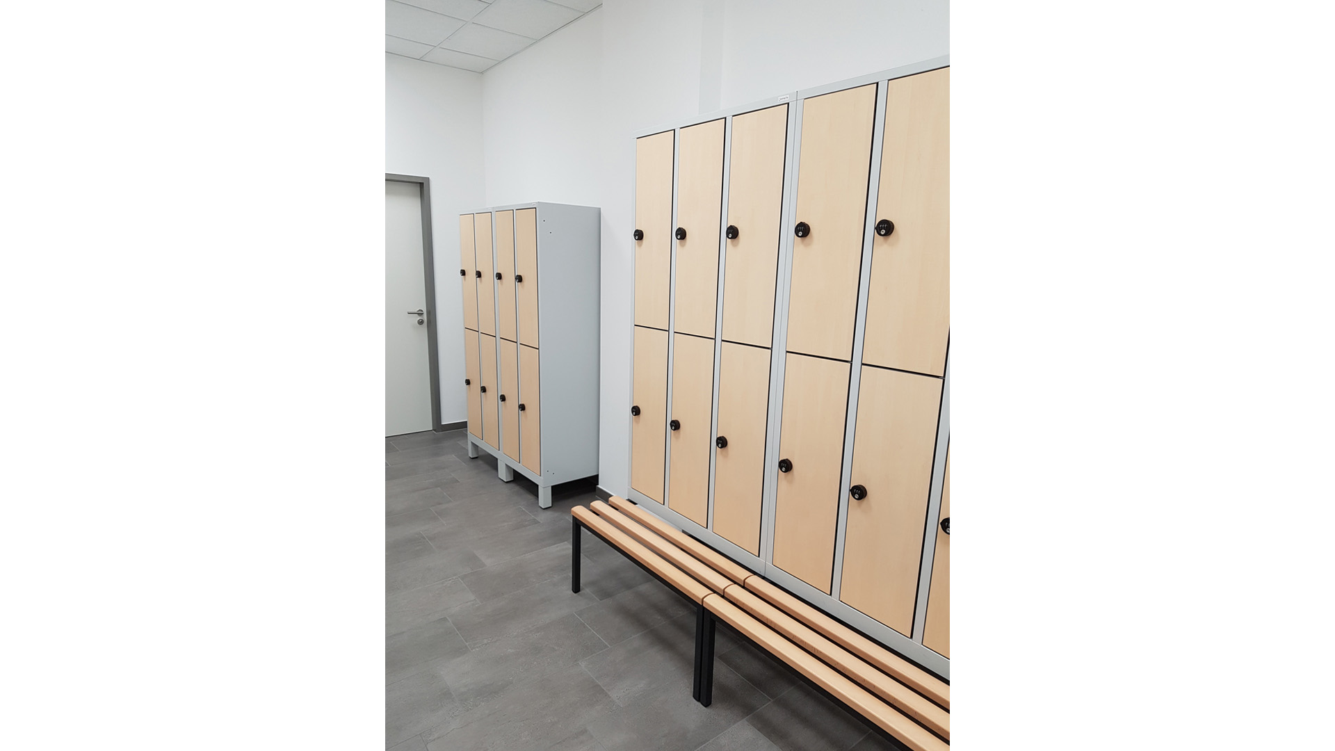 Die deutschlandweit tätige Dibag Industriebau AG entschied sich für die Serie S3000 Evolo mit MDF Dekortüren von Spindmax. Man entschied sich für einen Doppelstock Spind und einem Doppelstock Spind der auf einem Sitzbankuntergestell steht. Gegenüber der Spinde wurde an der Wand ein großer Spiegel montiert unter welchem man eine große Sitzbank aufgestellt hat um dem Personal das umziehen im sitzen zu erleichtern. Die MDF Dekortüren kombiniert mit den Buchenleisten der Sitzbänke geben dem Raum nun ein ganz neues Bild.