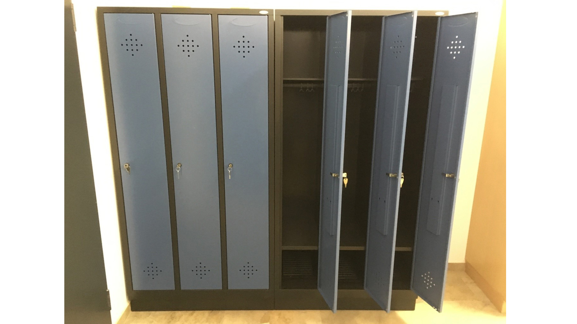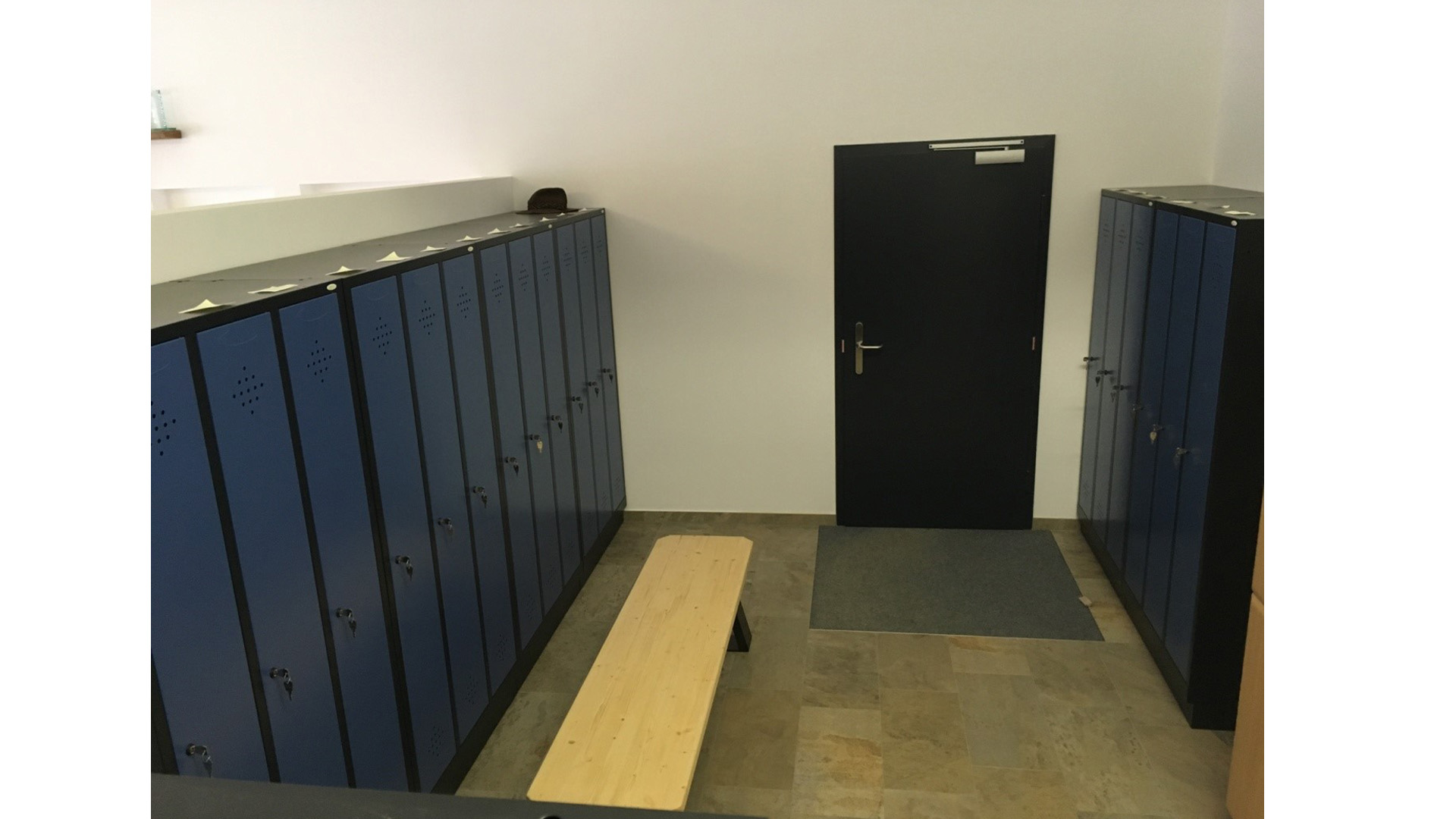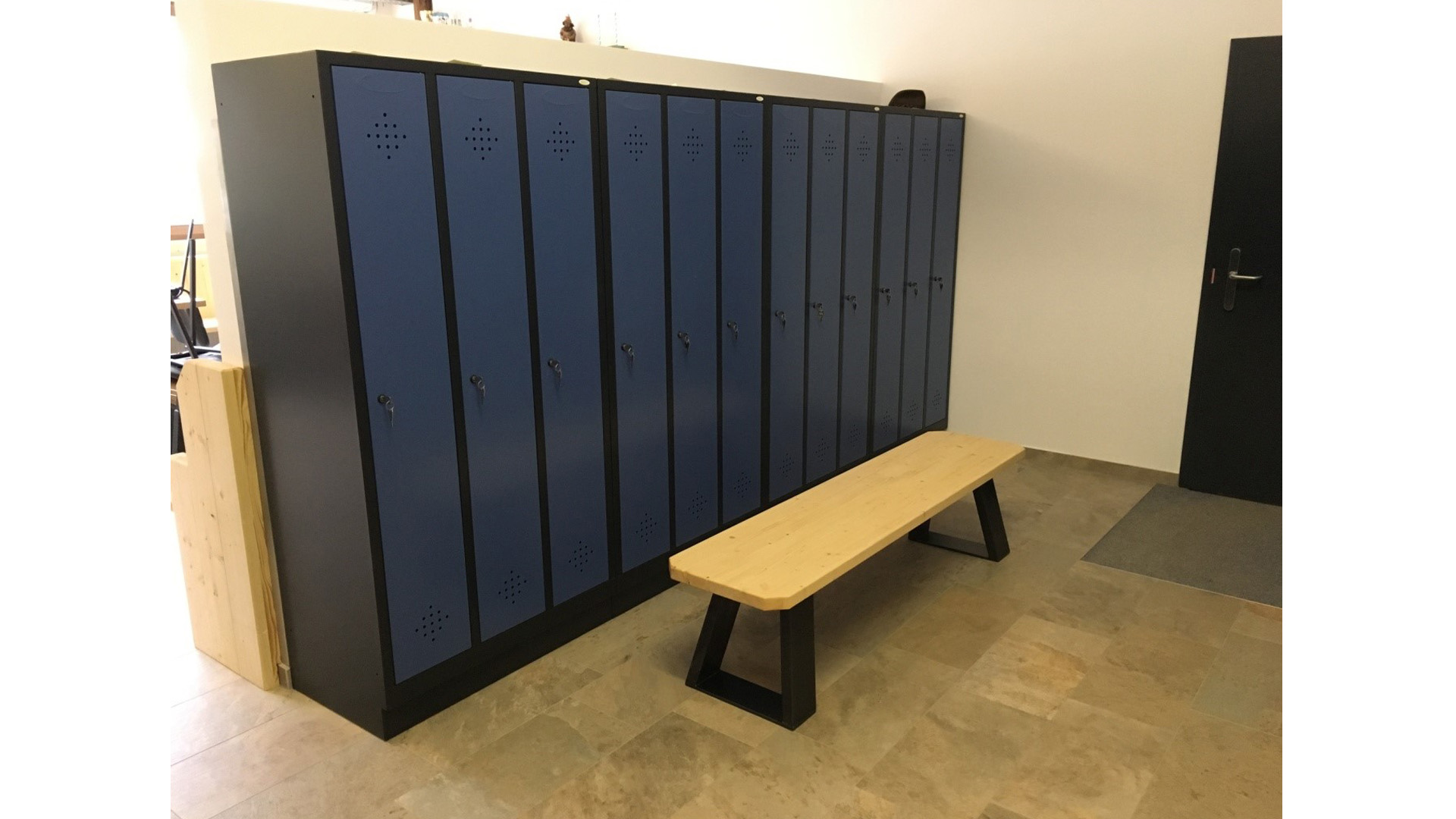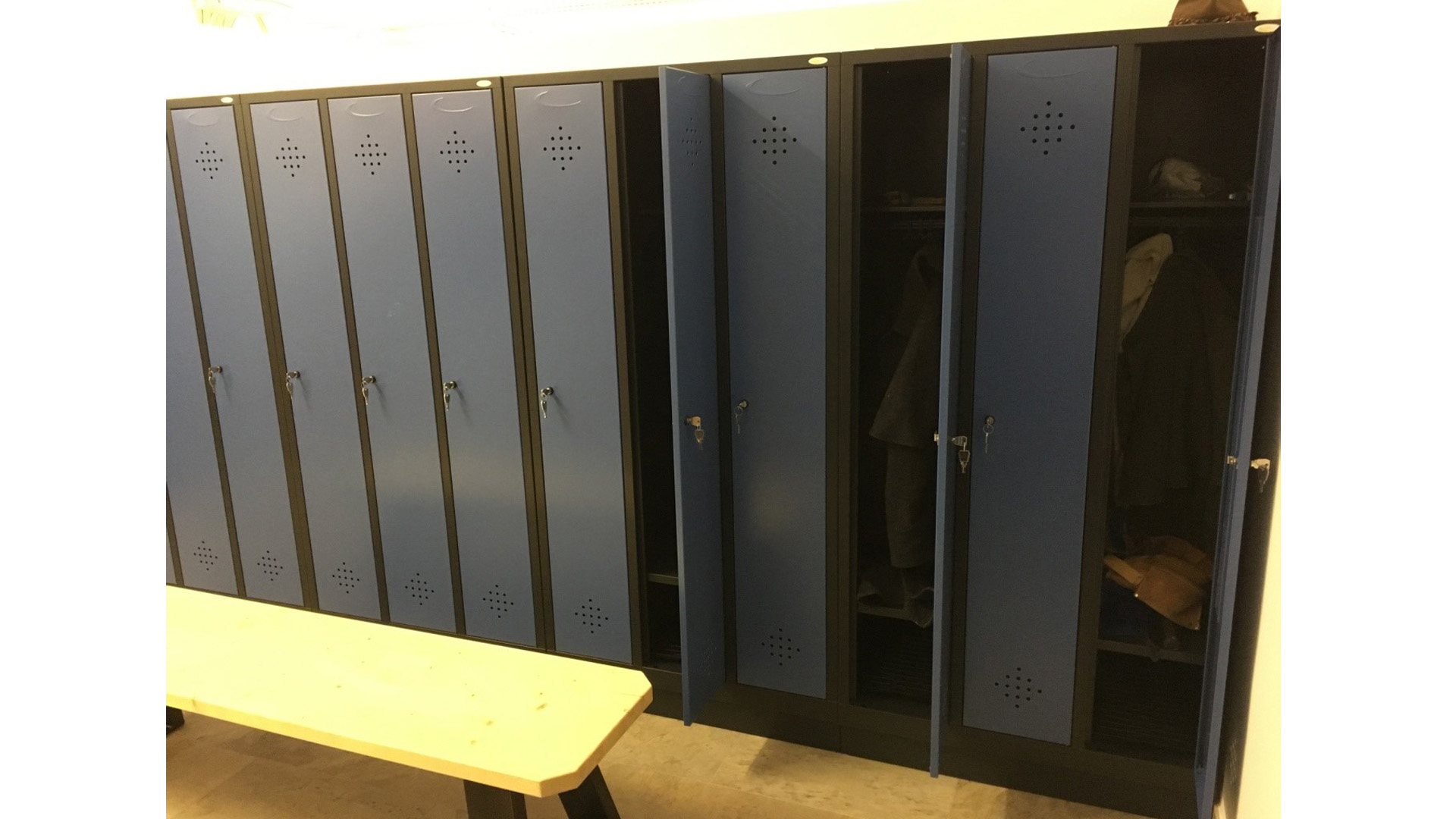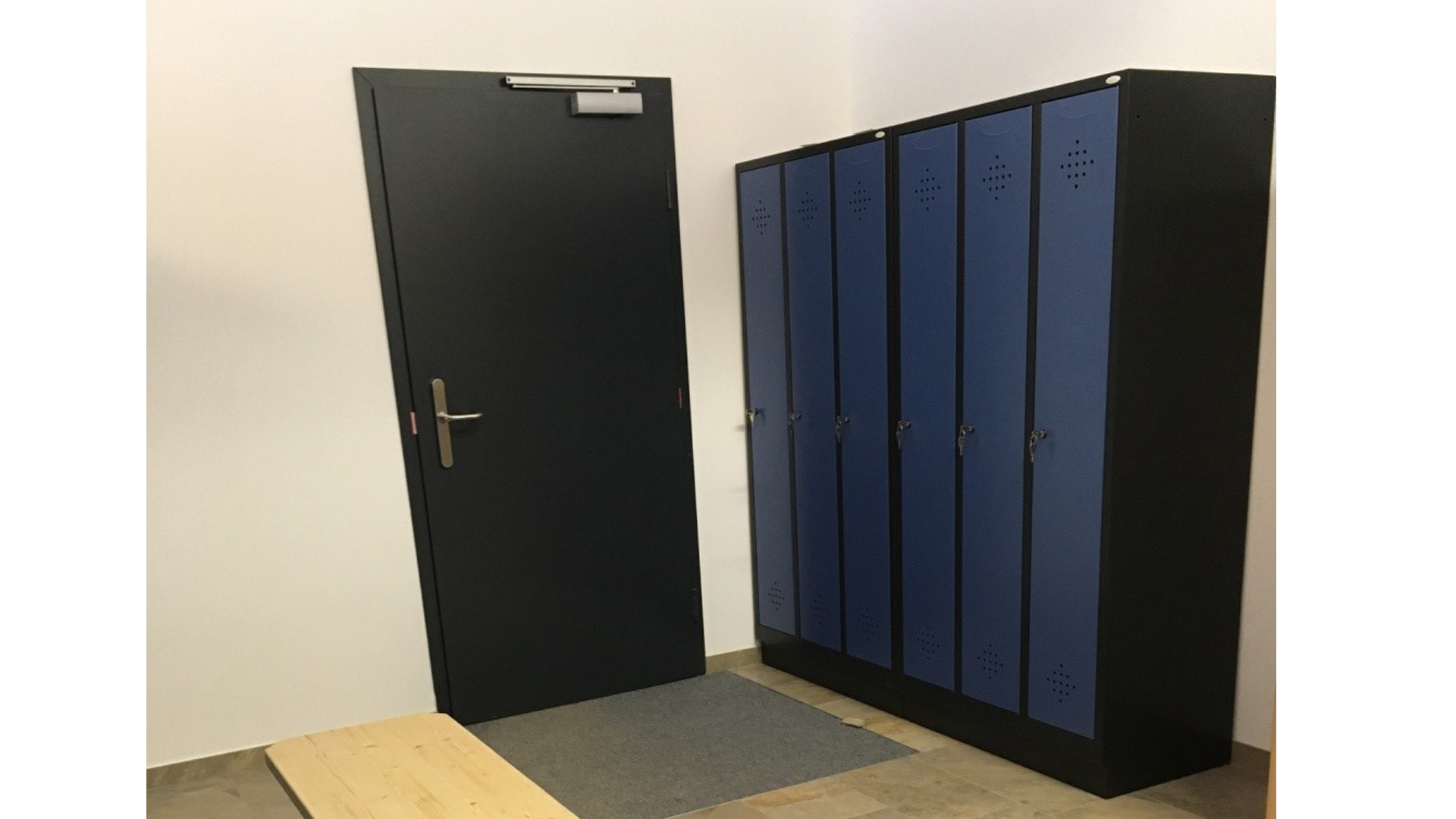 Unser Kunde hat sich für Spinde der Serie Grüne Linie entschieden. Diese werden nicht nur nachhaltig produziert sondern auch verpackungsfrei angeliefert. Jedes Abteil hat hier noch ein zusätzlichen Fachboden. Hier werden die Schuhe dann von der hängenden Kleidung getrennt und dennoch zusammen abgeschlossen. Der Korpus ist in Schwarzgrau RAL 7021 und die Türen in Fernblau RAL 5023