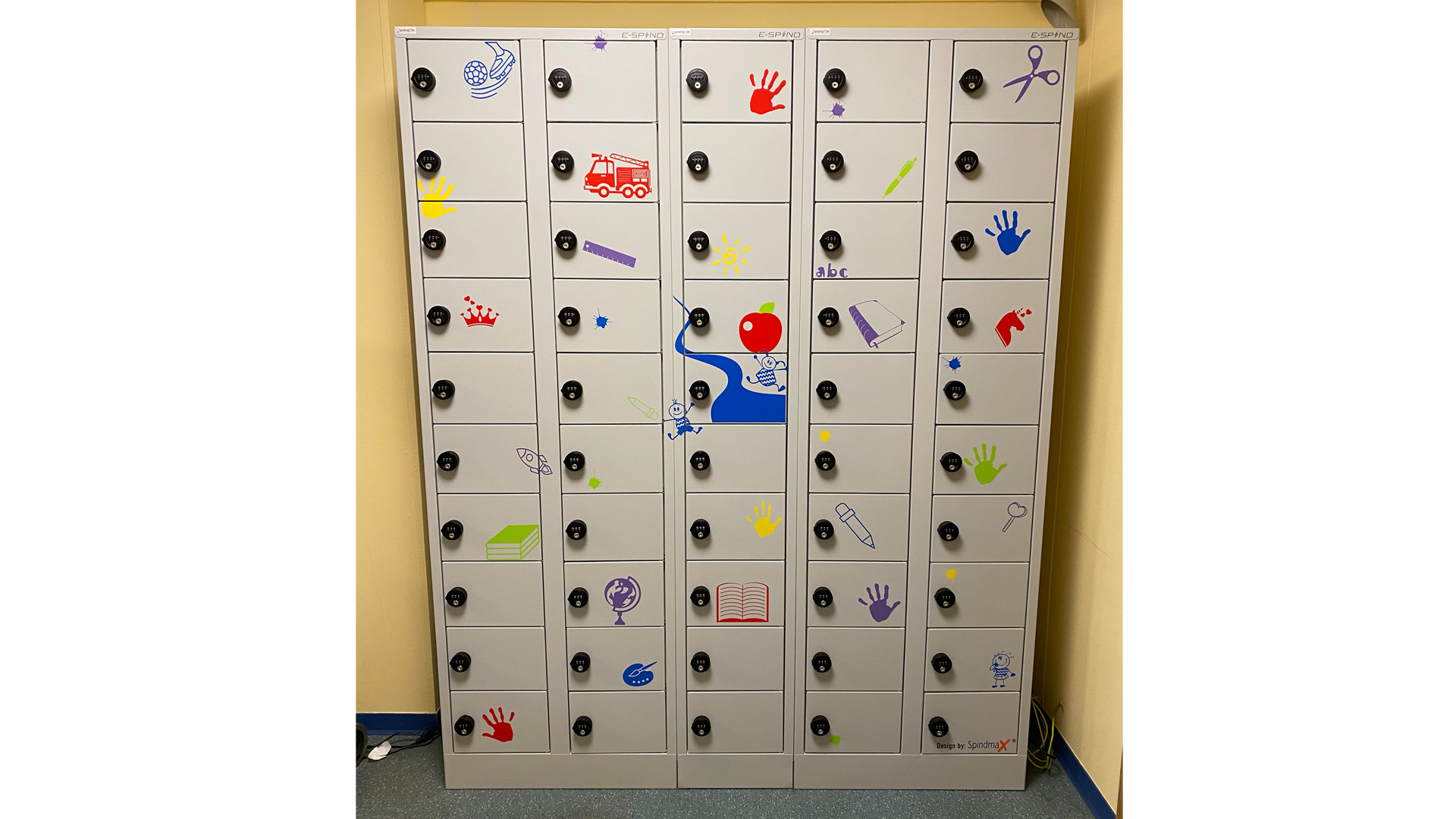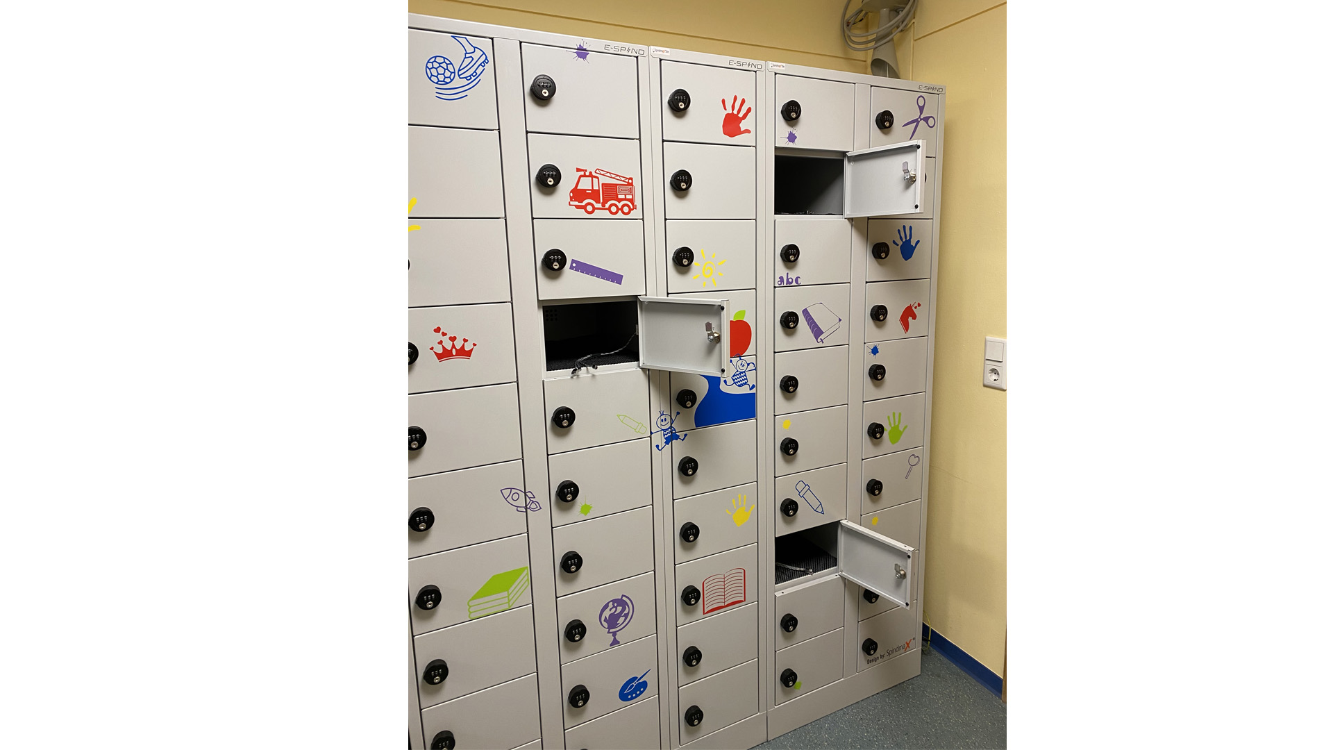 Nur wenige Wochen nach dem Produktlaunch unserer neuen E-Spinde haben wir eine Grundschule aus unserer Region mit den Tabletschränken ausgestattet. Alle SchülerInnen haben im Zuge der Digitalisierung der Schulen ein eigenes Tablet bekommen, welches über Nacht in der Schule verbleiben und dort geladen werden soll. Die Frage war nur "Wohin damit?" Bei der individuellen Planung der Ladeschränke standen wir in engem Austausch mit der Schulleiterin, sowie der Stadt Weinheim und konnten somit perfekt auf die Bedürfnisse vor Ort eingehen. So wurde zum Beispiel ein Schrank gewählt, bei dem die Fachgröße groß genug ist, um nicht nur das Tablet sicher zu verstauen. Auch für die dazugehörigen Kopfhörer ist noch ausreichen Platz vorhanden. Einem Sicherheitscheck durch den IT-Beauftragten der Stadt sowie den eines Elektrikers hielten unsere Tabletschränke selbstverständlich Stand.  Und noch etwas war beiden Seiten wichtig: Die E-Spind typischen Farben Anthrazitgrau/Orange sollten für das Schulprojekt weichen. Unser Grafiker hat ein individuelles Design entwickelt, welches nicht nur den Namen der Schule (Apfelbach Grundschule) aufgreift, sondern mit kindgerechten Motiven einen echten Hingucker bildet.