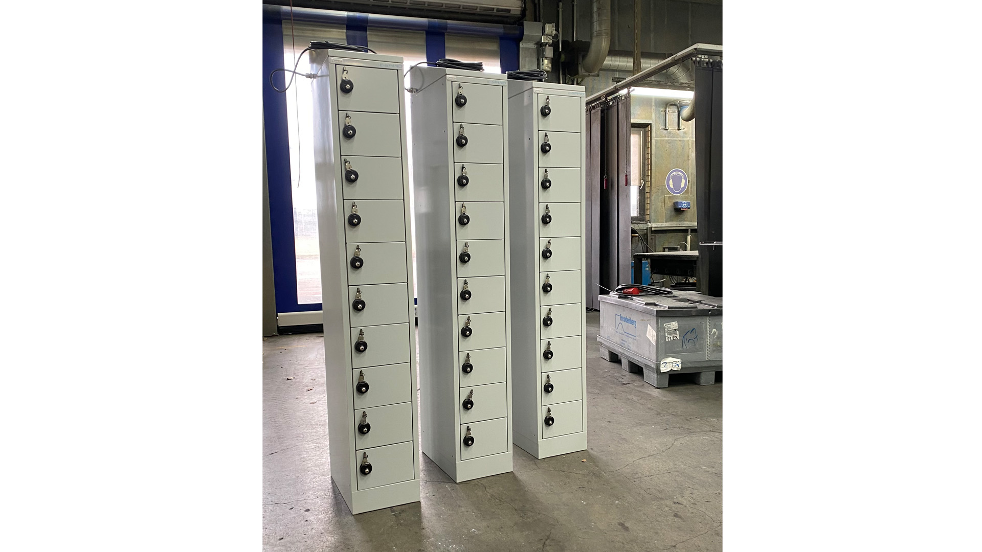 Seit Anfang Dezember werden unsere USB Ladeschränke auch im Industriepark Weinheim eingesetzt. Auf der Suche nach einer smarten Lösung zum Laden und dem gleichzeitigen sicheren Verfahren diverser elektronischer Geräte ist das Weinheimer Großunternehmen auf unsere E-Spinde aufmerksam geworden. In enger Zusammenarbeitmit dem Kunden entsanden acht USB Ladeschränke die auf dessen Bedürfnisse abgestimmt wurden.  Das Resultat davon kann sich sehen lassen. Durch den gelungenen Mix von Individualität und bewährter Technik wurden in kürzester Zeit genau die Ladeschränke hergestellt, die der Kunde gesucht und Schlussendlich dann bei Spindmax® gefunden hat.